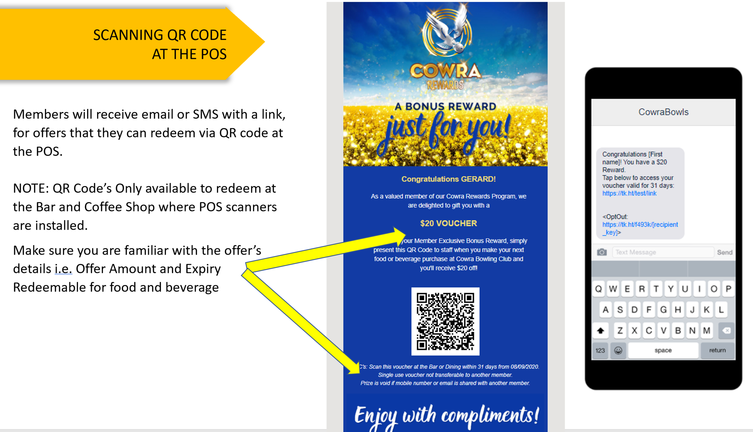 Send a personalised message to your targeted members via email, SMS or both! Messages branded in your venues theming can